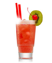 Modo de preparo: Encha meio copo com gelo picado, adicione o suco de morango e a cachaça. Coloque o leite de coco sobre o gelo. Decore com 1 morango, 2 cerejas e 1/2 morango na borda do copo.